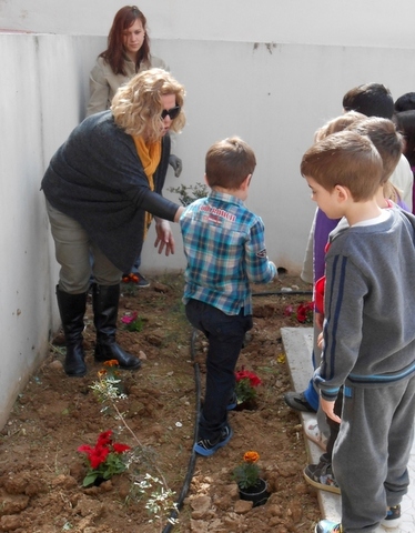 Τα παιδιά μαθαίνουν για την αξία του πρασίνου στη ζωή μας, την προστασία του περιβάλλοντος και φυτεύουν λουλούδια, ομορφαίνοντας την αυλή του σχολείου τους, με την καθοδήγηση της γεωπόνου της Διεύθυνσης Γεωτεχνικών Υπηρεσιών Δέσποινας Τοραμάν (φωτό κάτω).