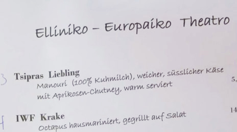 Το ελληνικό εστιατόριο «Ζ» στην περιοχή Κρόιτσμπεργκ του Βερολίνου σερβίρει εδώ και λίγες ημέρες πιάτα που φέρουν ονόματα εμπνευσμένα από την επικαιρότητα και την ελληνική κρίση.