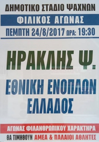 Φιλικό αγώνα φιλανθρωπικού χαρακτήρα θα δώσει σήμερα Πέμπτη 24/8 στο Δημοτικό στάδιο Ψαχνών ο Ηρακλής Ψαχνών με αντίπαλο την Εθνική ενόπλων δυνάμεων Ελλάδος