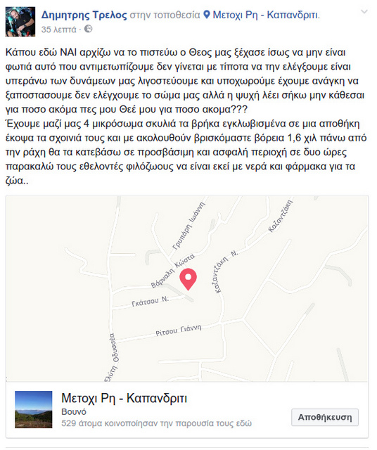 Έχουμε μαζί μας 4 μικρόσωμα σκυλιά, τα βρήκα εγκλωβισμένα σε μια αποθήκη, έκοψα τα σχοινιά τους και με ακολουθούν, βρισκόμαστε βόρεια 1,6 χιλ πάνω από την ράχη, θα τα κατεβάσω σε προσβάσιμη και ασφαλή περιοχή σε δυο ώρες, παρακαλώ τους εθελοντές φιλόζωους να είναι εκεί με νερά και φάρμακα για τα ζώα..."