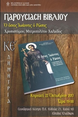 Ο Μητροπολιτικός Ιερός Ναός Αγίου Δημητρίου Χαλκίδας, στο πλαίσιο των φετινών εκδηλώσεων " ΚΕ΄ Δημήτρια", διοργανώνει εκδήλωση παρουσίασης του βιβλίου "Ο Όσιος Ιωάννης ο Ρώσος".