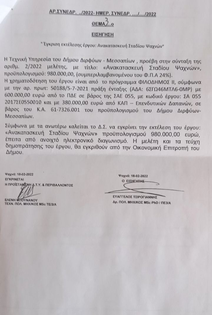 Το σημαντικότερο θέμα χτες για το Δημοτικό Συμβούλιο ήταν το 3 θέμα Ανακατασκευή Σταδίου Ψαχνών. Ένα έργο σημαντικό που θα κουμπώσει με το κλειστό γήπεδο με το τεννις τα 5Χ5 και το 8Χ8 γήπεδα ποδοσφαίρου και θα δώσει στο Δημοτικο Στάδιο Ψαχνων την αίγλη που του αρμόζει.